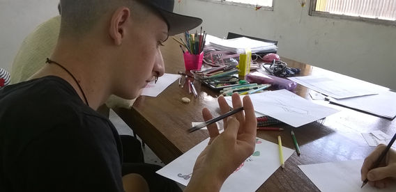 Oficina de moda, com inspiração em poesias. Trabalhando técnicas de criação de croquis, coloração e preenchimento, customização de peças e criação de acessórios com reciclados e resíduos têxteis.