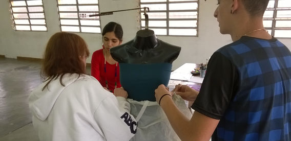 Oficina de figurino, trabalhando técnicas de criação de croquis e confecção de peças, corte, costura e customização.